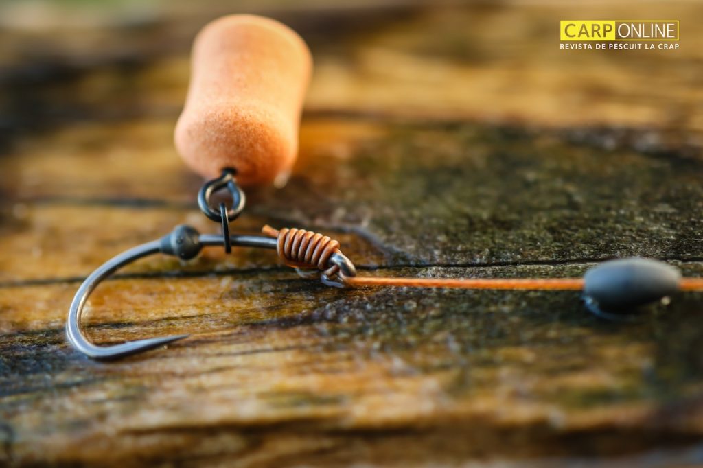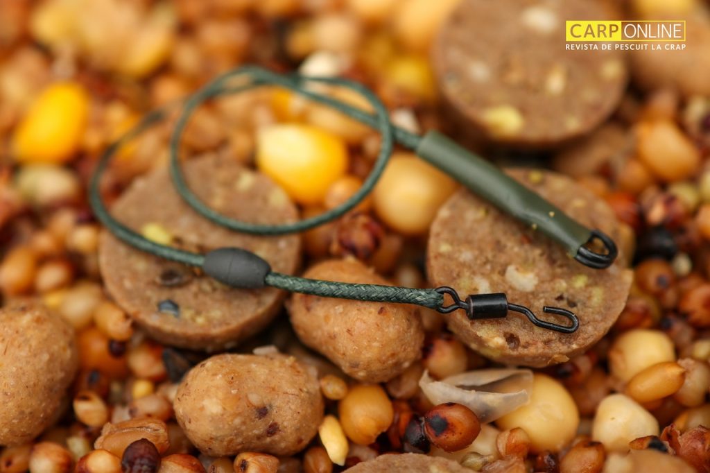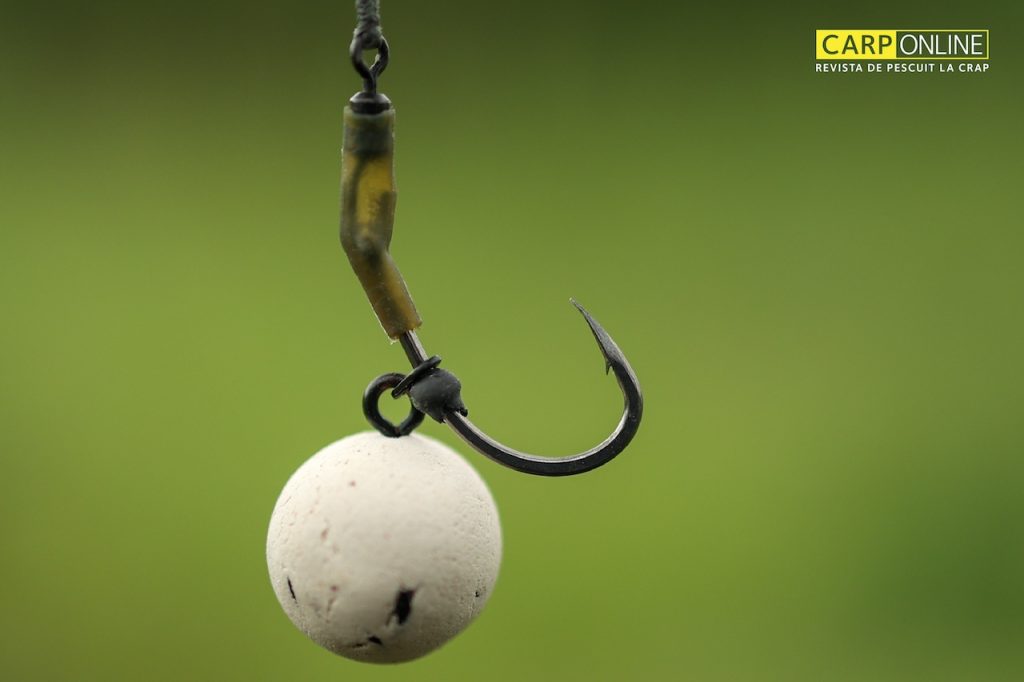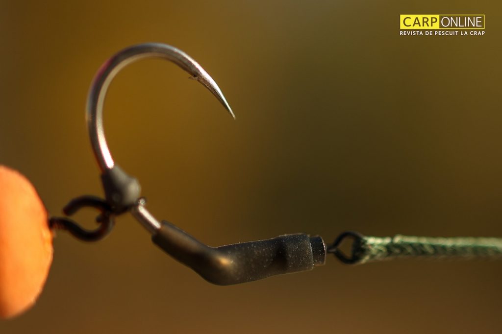 Cârligul se pune pe vârtej și trebuie asigurat cu un adaptor Line Aligner. Se poate folosi și tub termo, dar prefer adaptorul Line Aligner pentru că e mai ușor de lucrat cu el, e refolosibil și pot să schimb cârligul mai repede. Îmi pregătesc câteva cârlige din timp cu toate componentele puse pe ele, inclusiv boiliesul de cârlig. Le păstrez în borcanul cu wafters. Când vreau să schimb cârligul, iau din borcan un cârlig nou cu wafterul atașat. E o metodă de lucru rapidă și eficientă.